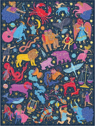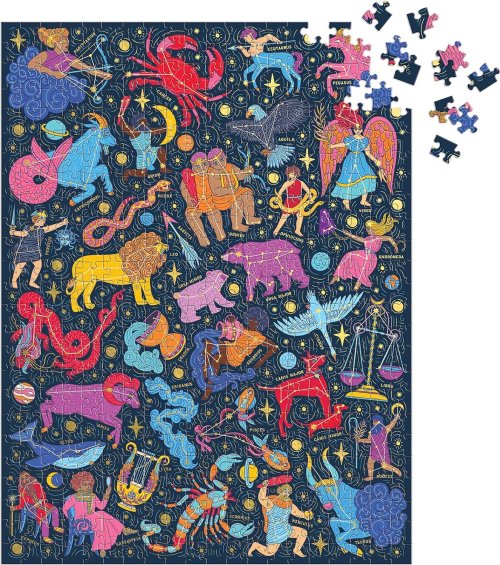 Jasné a odvážně barevné ilustrace zvěrokruhu a souhvězdí, Baleno v magnetické krabičce ve tvaru knihy . Obsahuje předlohu skládaného motivu s pojmenováním a umístěním 35 hlavních souhvězdí (texty v angličtině). Části motivu mají speciální povrch, který se na světle z různých úhlů kovově leskne a vytváří tak dojem, že je puzzle ze zlata, stříbra a dalších lesklých kovů. Je to dokonalý dárek pro milovníky astrologie i puzzle.