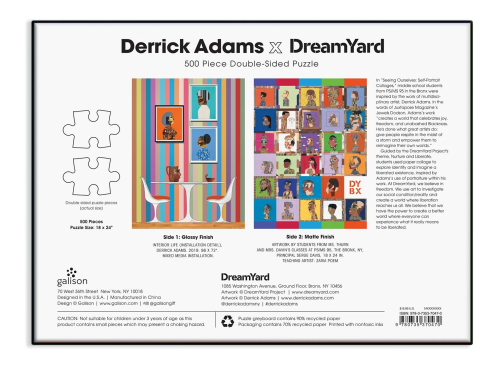 Dvojnásobná porce! Oboustranné puzzle obsahuje na jedné straně obraz od umělce Derricka Adamse a na druhé straně obrazy od studentů střední školy Dreamyard v Bronxu, kteří se inspirovali Adamsovým …
