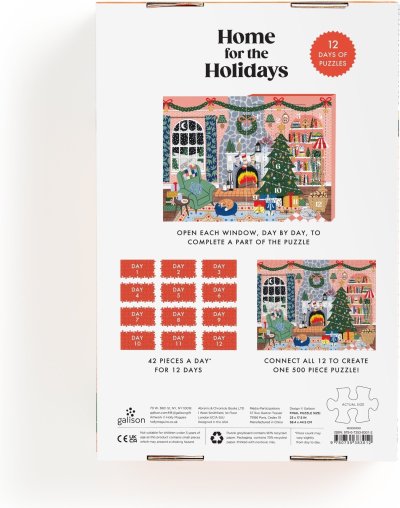 kalendář obsahuje 12 puzzle částí, každé puzzle má 42 dílků, po spojení všech částí je výsledný rozměr puzzle cca 58,4 x 44,5 cm.