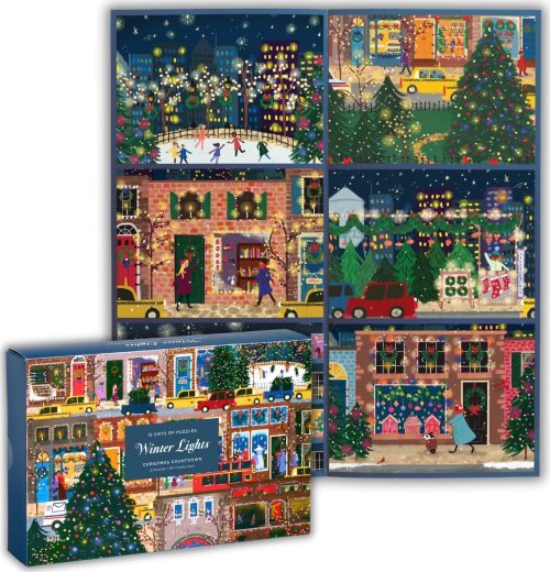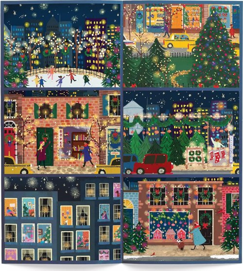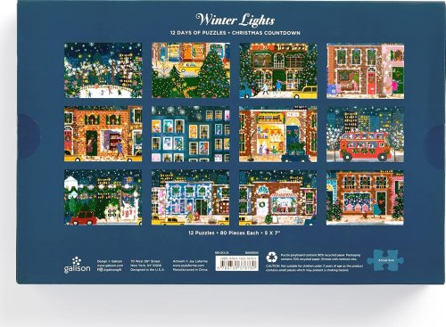 12ti denní Adventní kalendář se sadou 12 puzzle se stejným rozměrem a počtem dílků. Okouzlující minipuzzle s obrázky zimních radovánek ve městě využívají oblíbenou grafiku od Joe Laforme. Po vysunutí vnějšího obalu se objeví předloha a vnitřní obal se 12 tradičními okýnky . Každý den otevřete jedno, poskládáte puzzle a Vánoce jsou tady. Součástí balení je oboustranná předloha se 12 motivy puzzle. Rozměr složeného puzzle cca 12,7 x 17,8 cm