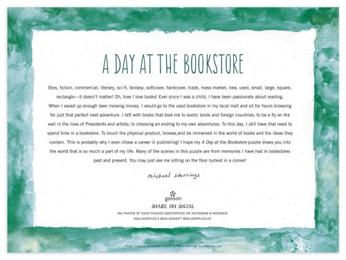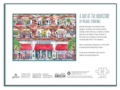 Dejte dohromady každou část dne stráveného v knihkupectví s tímto 1000dílným puzzle. Uklidňující akvarely od oceňovaného designéra, ilustrátora a kreativního ředitele Michaela Storringse dokonale zachycují kouzlo a potěšení, které lze nalézt v knihkupectví. Puzzle jsou baleny v pevných krabicích s matným povrchem. Hlavní vlastnosti: Obsahuje 1000 dílkůPotištěno netoxickými inkoustyPrémiová kvalita puzzleJednotlivé dílky do sebe přesně pasujíRozvíjí logické myšlení a motoriku