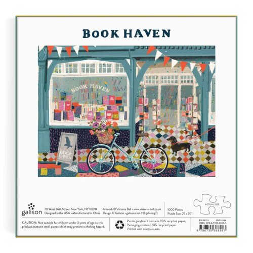 Kniha Book Haven obsahuje okouzlující ilustraci bestsellerové umělkyně Victoria Ball z knihkupectví s rozkošným pozdravem jezevčíka u předních dveří. Puzzle je baleno v pevné krabici, pro opětovné použití a skladování. Ideální jako dárek. Autorem obrázku je Victoria Ball. Puzzle jsou vyrobeny za použití významného podílu recyklovaného papíru a nabízí špičkový potisk nezávadnými barvami. Jsou opatřeny matnou povrchovou úpravou, která zajišťuje za všech okolností věrné podání detailů i barev. Jejich zadní strana je potažena hladkým, na dotek příjemným povrchem, díky němuž se při skladování rozloženého puzzle netvoří prach. Spolu s pečlivě zabalenými dílky naleznete v balení také letáček s návodným obrázkem, který zpravidla obsahuje další informace o tvůrcích a pozadí vzniku díla. Dodáváno v mimořádně pevné a poutavě zpracované kartonové krabičce vyrobené z recyklovaného kartonu. Hlavní vlastnosti: 1000 precizně vyřezaných dílkůvyrobeno s použitím recyklovaných a udržitelně získaných materiálůpečlivě vybraný motiv od renomovaných tvůrců a umělcůpotisk a provedení nejvyšší kvalityobsahuje návodný obrázek