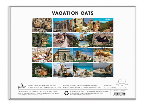 Vtipné 1500dílné puzzle s kočkami na prázdninách. Najdete zde 16 velice reálných fotografií, ve kterých kočky odpočívají a kochají se známými místy celého světa. Puzzle Galison jsou zabaleny v matných, pevných krabicích, jsou perfektní jako dárek. Můžete ji také použít jako úložný prostor. V balení také obrázek plně sestaveného puzzle jako předloha. Hlavní vlastnosti: Obsahuje 1500 dílkůPrémiová kvalita puzzleJednotlivé dílky do sebe přesně pasujíRozvíjí logické myšlení a motoriku