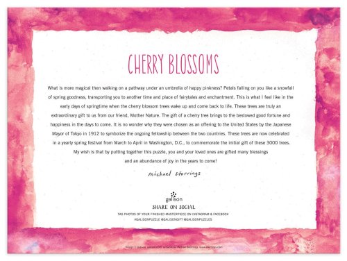 Oceňovaný designér, ilustrátor Michael Storrings zachycuje krásu sezóny Cherry Blossom ve Washingtonu, DC. Puzzle je baleno v pevné krabici, pro opětovné použití a skladování. Ideální jako dárek. Autorem obrázku je Michael Storrings. Puzzle jsou vyrobeny za použití významného podílu recyklovaného papíru a nabízí špičkový potisk nezávadnými barvami. Jsou opatřeny matnou povrchovou úpravou, která zajišťuje za všech okolností věrné podání detailů i barev. Jejich zadní strana je potažena hladkým, na dotek příjemným povrchem, díky němuž se při skladování rozloženého puzzle netvoří prach. Spolu s pečlivě zabalenými dílky naleznete v balení také letáček s návodným obrázkem, který zpravidla obsahuje další informace o tvůrcích a pozadí vzniku díla. Dodáváno v mimořádně pevné a poutavě zpracované kartonové krabičce vyrobené z recyklovaného kartonu. Hlavní vlastnosti: 1000 precizně vyřezaných dílkůvyrobeno s použitím recyklovaných a udržitelně získaných materiálůpečlivě vybraný motiv od renomovaných tvůrců a umělcůpotisk a provedení nejvyšší kvalityobsahuje návodný obrázek