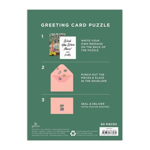 Přání a puzzle v jednom! Pohlednicové puzzle s krásně ilustrovaným jarním dnem ve městě. Napište přání na zadní stranu, rozdělte na kousky, vložte do obálky a pošlete poštou. Obálka je součástí balení. Dokonalé překvapení, které můžete poslat rodině nebo přátelům. Ideální jako dárek. Autor obrázku je Joy Laforme. Puzzle jsou vyrobeny za použití významného podílu recyklovaného papíru a nabízí špičkový potisk nezávadnými barvami. Jsou opatřeny matnou povrchovou úpravou, která zajišťuje za všech okolností věrné podání detailů i barev. Jejich zadní strana je potažena hladkým, na dotek příjemným povrchem, díky němuž se při skladování rozloženého puzzle netvoří prach. Spolu s pečlivě zabalenými dílky naleznete v balení také letáček s návodným obrázkem, který zpravidla obsahuje další informace o tvůrcích a pozadí vzniku díla. Dodáváno v mimořádně pevné a poutavě zpracované kartonové krabičce vyrobené z recyklovaného kartonu a udržitelně získaných materiálů s certifikací FSC®. Hlavní vlastnosti: 60 precizně vyřezaných dílkůvyrobeno s použitím recyklovaných a udržitelně získaných materiálůpečlivě vybraný motiv od renomovaných tvůrců a umělcůpotisk a provedení nejvyšší kvality