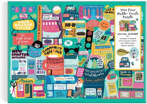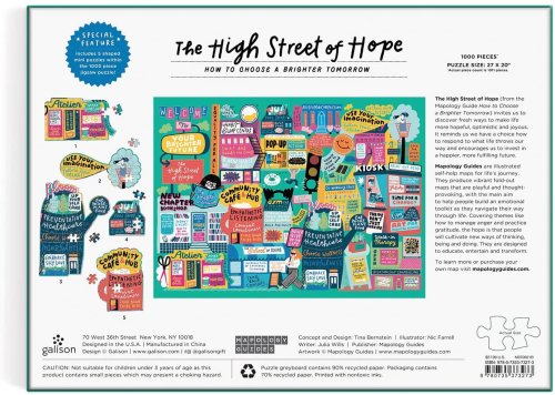 Puzzle Hlavní ulice naděje obsahuje nápisy v angličtině , které inspirují k objevování různých způsobů a možností, jak být veselejší, optimističtější, kurážnější a štastnější. Myšlenky vybízí k osvojení si nových způsobů myšlení, bytí a jednání. Puzzle obsahuje 5 miniaturních obrysových puzzle, které jsou jeho nedílnou součástí. Balení obsahuje předlohu skládaného motivu. Rozměr složeného puzzle cca 69 x 51 cm