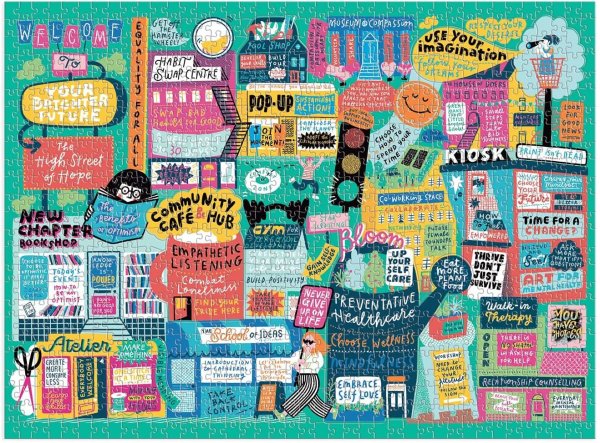 Puzzle Hlavní ulice naděje obsahuje nápisy v angličtině , které inspirují k objevování různých způsobů a možností, jak být veselejší, optimističtější, kurážnější a štastnější.