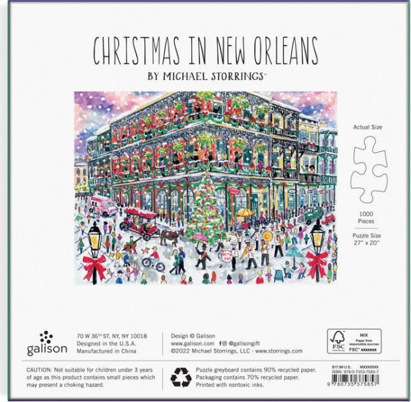 Jak asi vypadá vánoční nálada v rušném srdci New Orleans, ve staré francouzské čtvrti? Jak se sluší na kolébku jazzu, ulicemi hraje hudba, lidé se shledávají, zpívají a tančí. Touto jedinečnou sváteční atmosférou se teď můžete nechat unášet při skládání puzzle! Autorem obrázku je cenami ověnčený designér a ilustrátor Michael Storrings. Puzzle Galison jsou vyrobeny za použití významného podílu recyklovaného papíru a nabízí špičkový potisk nezávadnými barvami. Jsou opatřeny matnou povrchovou úpravou, která zajišťuje za všech okolností věrné podání detailů i barev. Jejich zadní strana je potažena hladkým, na dotek příjemným povrchem, díky němuž se při skladování rozloženého puzzle netvoří prach. Spolu s pečlivě zabalenými dílky naleznete v balení také letáček s návodným obrázkem, který zpravidla obsahuje další informace o tvůrcích a pozadí vzniku díla. Dodáváno v mimořádně pevné a poutavě zpracované kartonové krabičce vyrobené z recyklovaného kartonu a udržitelně získaných materiálů s certifikací FSC®. Hlavní vlastnosti:1000 precizně vyřezaných dílkůvyrobeno s použitím recyklovaných a udržitelně získaných materiálůpečlivě vybraný motiv od renomovaných tvůrců a umělcůpotisk a provedení nejvyšší kvalityobsahuje návodný obrázek