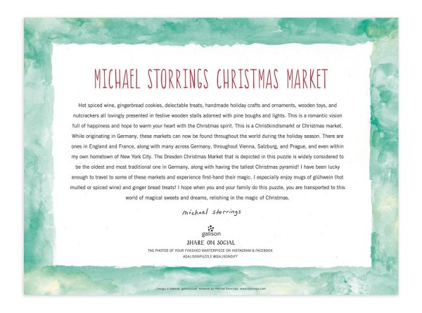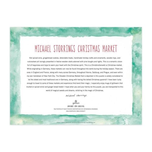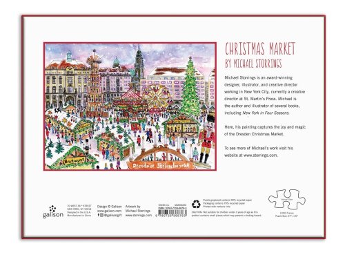 Vánoce v Drážďanech 1000dílné puzzle oživuje shon a shon zasněžených německých Vánoc v Drážďanech. Puzzle jsou baleny v pevných krabicích s matným povrchem. Oceňovaný ilustrátor Michael Storrings zachycuje zvláštní podstatu a kouzlo měst v různých ročních obdobích. Hlavní vlastnosti: Obsahuje 1000 dílkůPotištěno netoxickými inkoustyPrémiová kvalita puzzleJednotlivé dílky do sebe přesně pasujíRozvíjí logické myšlení a motoriku