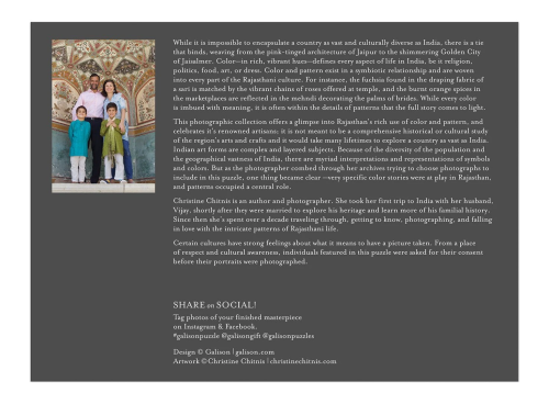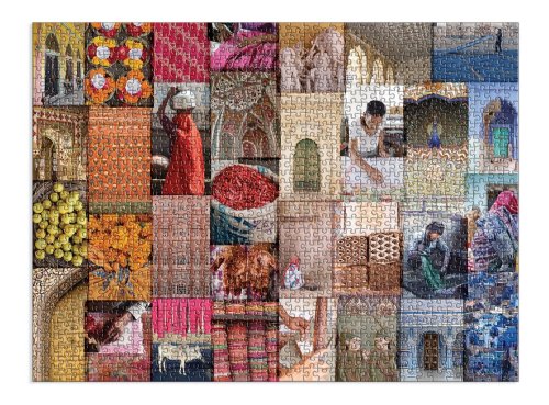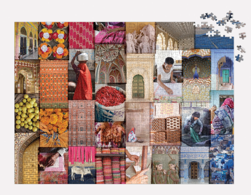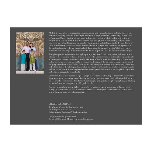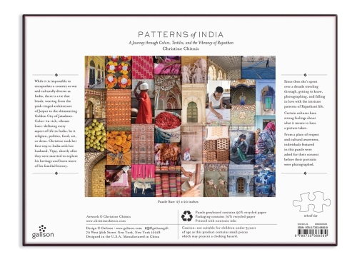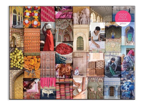 Vzory Indie: Cesta barvami, textiliemi a živostí Rádžasthánu. 1000dílné puzzle složené z 32 fotografií z nádherné knihy Christine Chitnis. I přes to, že je Indie rozlehlá a kulturně různorodá, fotografie Chitnis ji krásně spojují, od nádherné růžové architektury Džajpuru až po zlaté město Džajsalmér. Puzzle Galison jsou zabaleny v matných, pevných krabicích, jsou perfektní jako dárek. Můžete ji také použít jako úložný prostor. V balení také obrázek plně sestaveného puzzle jako předloha. Hlavní vlastnosti: Obsahuje 1000 dílků Prémiová kvalita puzzle Jednotlivé dílky do sebe přesně pasují Rozvíjí logické myšlení a motoriku