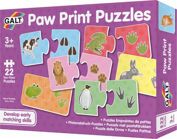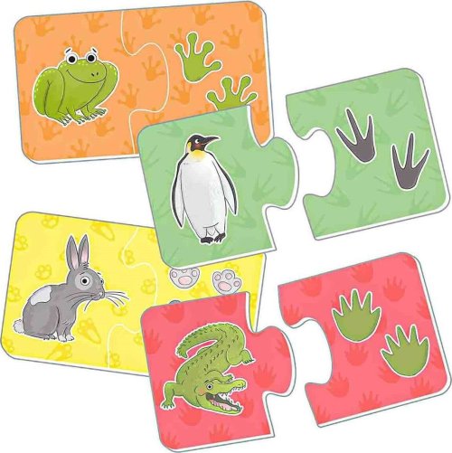 Puzzle obsahuje 22 dvojdílných puzzle, na kterých jsou zvířátka, která musí být spárována se stopami, které po sobě zanechala. Nejprve se děti učí párovat barvy a poté postupně rozpoznávat různé stopy zvířat. Puzzle pomáhají podporovat kognitivní vývoj dětí, jako je rozpoznávání barev a tvarů, ale také rozpoznávání zvířecích stop. Přibližná velikost jednoho puzzle: 12 x 7 cm. Rozměr složeného puzzle cca 12 x 7 cm