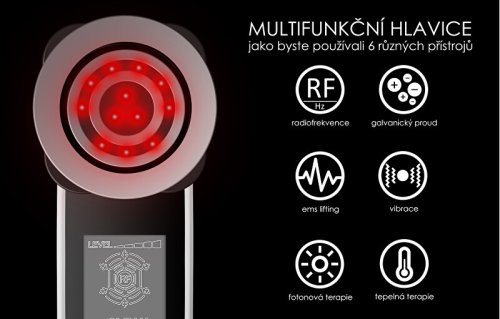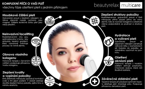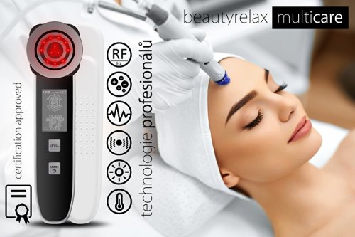Profesionální kosmetický přístroj k ošetření pleti nabízí moderní technologie, které jsou nejpoužívanější v dermatologii a kosmetickém odvětví. Začněte o pleť pečovat na profesionální úrovni i vy. Co můžete očekávat? Postupné zlepšení pružnosti pleti. Pokožka bude působit svěžejším dojmem. Eliminaci hlubokých i jemných mimických vrásek. Zvýraznění charakteristických kontur obličeje. Stimulaci obličejových svalů. Prokrvení a okysličení podkožní tkáně. Jemná lymfatická masáž pro redukci otoků obličeje. Účinnou podporu buněčného metabolismu a vstřebávání živin. Hlavní výhody Neinvazivní ošetření (přístroj neproniká přímo skrz pokožku). Ošetření bez jakýchkoliv nepříjemných pocitů. Bez nežádoucích trvalých změn pigmentace pleti. Ihned po proceduře lze použít kosmetické přípravky. Bez omezení pokračovat v jakýchkoliv aktivitách (např. před společenským programem). Specifikace 5 automatických programů Multicare s přednastavenými režimy ošetření pleti: Radiofrekvence Aplikační hlavice generuje energii prostřednictvím radiofrekvenčních vln se zcela specifickým výkonem a frekvencí. Radiofrekvenční vlny jsou optimalizovány k tomu, aby způsobily tepelný gradient, který významně ovlivňuje procesy ve vrstvě dermis. Dodaná energie aktivuje remodelaci kolagenových vláken a elastinu. Maximální možné zacílení energie i v lokalitách s výraznější tukovou vrstvou a následná excitace metabolických procesů má významný vliv na velmi efektivní vyhlazení povislých a deformovaných kontur. Galvanický proud Aplikační hlavice vytváří na svém povrchu proud s možností proměnlivého náboje. Řídící jednotka kosmetického přístroje umožňuje úpravu galvanického proudu takovým způsobem, aby docházelo ke kladnému či zápornému náboji. Kladná a záporná ionizace má odlišné účinky na pleť. Kladná ionizace - důkladné vyčištění pleti Kladná ionizace vytáhne záporně nabité nečistoty jako magnet. Zažijete skutečně čistou pleť jako nikdy předtím. Pouze čistá pleť je ta zdravá! Záporná ionizace - hloubkové vyživení pleti Galvanický proud penetruje výživové látky z kosmetických sér hluboko do pokožky. Je zabráněno vyschnutí na povrchu. Absolutní turboefekt pro vaše kosmetické přípravky! EMS Náš obličej je protkaný strukturou svalů. Obličejové svaly jsou zodpovědné za výraz a mimiku. Působením času svaly ztrácí přirozenou pružnost a elasticitu. Pleť působí fádním a unaveným dojmem. Aplikační hlavice BeautyRelax Multicare přenáší při kontaktu s pletí jemné elektrické mikropulzy, které pronikají přes svrchní část pokožky přímo k obličejovým svalům. Výkon a frekvence elektrických pulzů jsou speciálně upraveny tak, aby umožnily účinné, ale zároveň bezbolestné ošetření obličeje. Dochází ke kontrakci svalů a tím jejich posílení. Kolagenní a elastická vlákna jsou mechanicky stimulována. V oblasti obličeje docílíte zlepšení textury pokožky, jejího tónu a nárůstu elasticity. Pleť má omlazený a prozářený vzhled. To vše neinvazivně a bez jakýchkoliv nepříjemných pocitů. Vibrace Správná funkce lymfatického systému platí nejen pro tělesné končetiny, ale také pro náš obličej. Pokud máme lymfu a krevní oběh v pořádku, odvod nečistot z krve probíhá násobně lepším způsobem. Zlepšení krevního oběhu = stimulace lymfatického systému = lepší odvod nečistot a škodlivin z těla = krásná a zdravá pleť. Jednoduchá rovnice, která platí nejen pro obličej, ale pro celé naše tělo. Jemná vibrační masáž patří z technologického hlediska mezi nejjednodušší, ale zároveň velmi účinnou techniku ošetření pleti. Fotonová terapie Světlo je zjednodušeně viditelná část elektromagnetického záření různé frekvence. Dosahuje různých vlnových délek v intervalu 390 až 760nm (nanometrů). Lidské oko je schopné vnímat světlo o vlnových délkách v rozsahu od 400 do 800nm. Při fotonové terapii proniká světlo do těla jako proud energie ve formě fotonů. Je vědecky prokázáno, že různé vlnové délky světla mají za následek specifické účinky při péči o pleť. Studie ověřily reálný pozitivní terapeutický přínos pro živé tkáně a organismy na buněčné úrovni. Další terapie: Tepelná terapie (červené a modré světlo) - Ošetření pleti aplikační hlavicí s nastavenou optimální teplotou výrazně ovlivňuje funkci lymfatického systému obličeje a jeho látkovou výměnu. Působením teploty kolem 15°C je obvykle ošetření pleti zakončeno. Pleť se zklidní a dochází ke stažení kožních pórů.