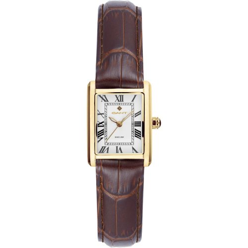 Dámské náramkové hodinky Napájení z baterie Průměr pouzdra 34,0 mm Pouzdro ve tvaru obdelníku Ocelové pouzdro Zlatavá barva pouzdra Kožený tah Hnědá barva tahu Ručičkový ciferník Stříbrná barva ciferníku Ciferník s římskými čísly Materiál skla - minerální sklo Odolné proti vodě během plavání
