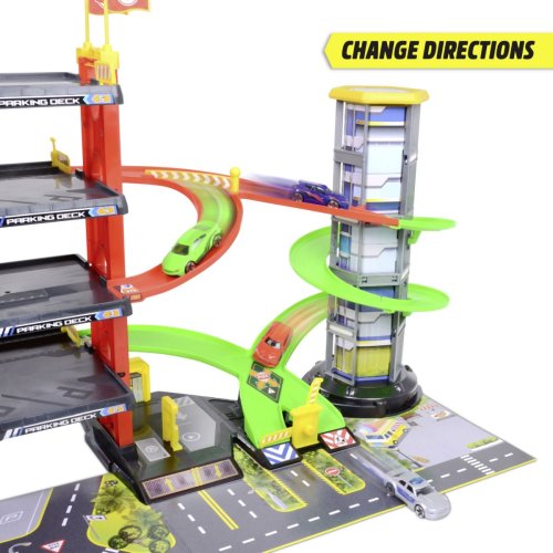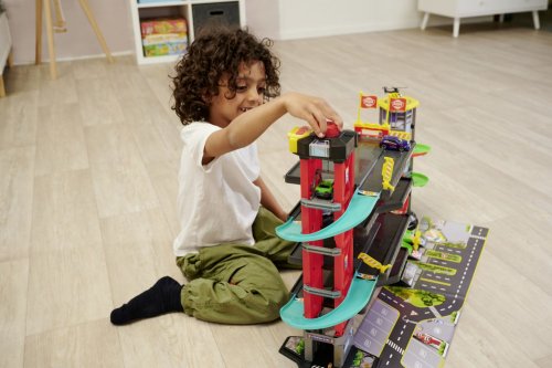 Parkovací garáž má 4 podlaží, dráhu, funkce zvuku i světel, manuální výtah. Součástí jsou 4 kovová autíčka, vrtulník a doplňky. Rozměry garáže: 81,5 x 22,5 x 52 cm.