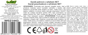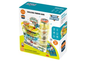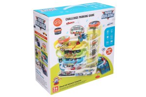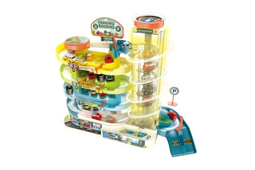 Garáž patrová s výtahem 6 aut. Rozměry 30x13x34 cm. Světelné a zvukové efekty. 3xAA baterie nejsou součástí. Provoz výtahu na baterie či manuálně (přepínač). Obrázkový návod na složení na zadní straně obalu.