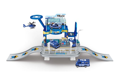 Garáž Policejní stanice s pumpou set. Rozměry stanice 65x19x24,5 cm. Obsah balení - garáž, 4xauto, 1x helikoptéra. Volná kola.