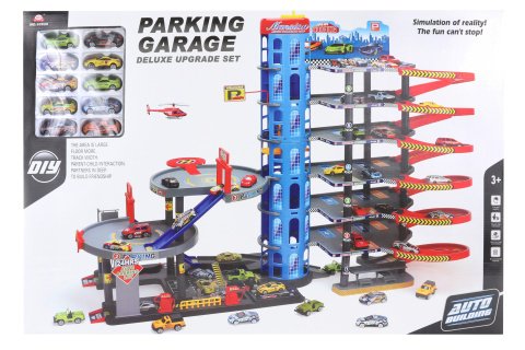 Velká plastová garáž s heliportem. Garáž má celkem 6 pater. Balení obsahuje 10 autíček. Velikost autíčka je cca 6,5 cm. Rozměry balení cca 85,5 x 58 x 14 cm. Věk 3+
