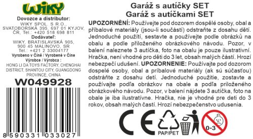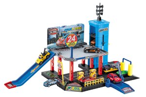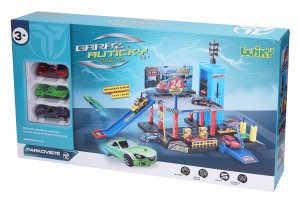 Garáž s výtahem a čerpací stanicí. Rozměry sestavené garáže 57x35x33 cm. Balení obsahuje 3 kovová autíčka 7 cm, volná kola.
