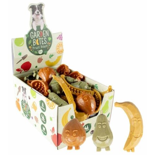 Vegetariánské pamlsky Garden Bites Fruit Blast jsou ideální odměnou pro vašeho psa. Obsahují velkorysý podíl batátů (55 %) doplněný banánem, broskví a hruškou. Batáty jsou bohaté na vitamíny, vápník a železo. Speciální tvar pamlsků pomáhá masírovat dásně a čistit zuby psa. Přírodní extrakt z máty navíc osvěžuje dech. 100% bezlepkové pamlsky jsou snadno stravitelné a díky tomu vhodné i pro psy s alergiemi. A navíc jsou chuťově naprosto neodolatelné! Balení obsahuje 60 ks pamlsků o délce cca 8,5 cm. Hlavní přednosti: