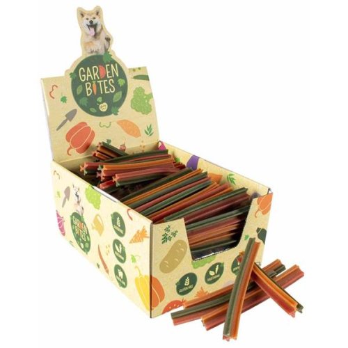 Vegetariánské pamlsky Garden Bites jsou ideální odměnou pro vašeho psa. Obsahují velkorysý podíl batátů (55 %) doplněný rajčaty, mrkví a okurkou. Batáty jsou bohaté na vitamíny, vápník a železo. Speciální tvar pamlsků pomáhá masírovat dásně a čistit zuby psa. Přírodní extrakt z máty navíc osvěžuje dech. 100% bezlepkové pamlsky jsou snadno stravitelné a díky tomu vhodné i pro psy s alergiemi. A navíc jsou chuťově naprosto neodolatelné! Balení obsahuje 108 ks pamlsků o délce 15 cm. Hlavní přednosti: