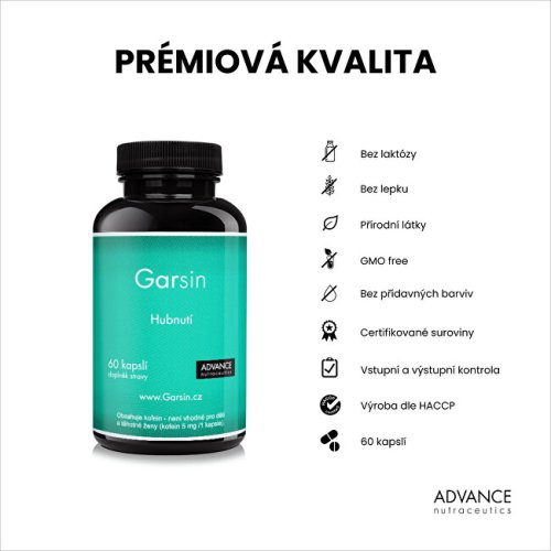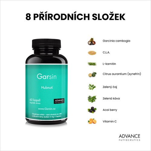 Garsin obsahuje unikátní kombinaci 8 látek, které přispívají k metabolismu tuků a kontrole tělesné hmotnosti.