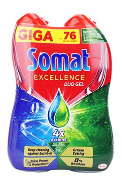 Somat Excellence Duo Gel do myčky kombinuje dvě vzájemně se doplňující receptury, které rozpouštějí připálené zbytky jídla a usazenou mastnotu. Somat gel nezanechává na nádobí žádné zbytky a dodává zářivý lesk při každém mycím cyklu.