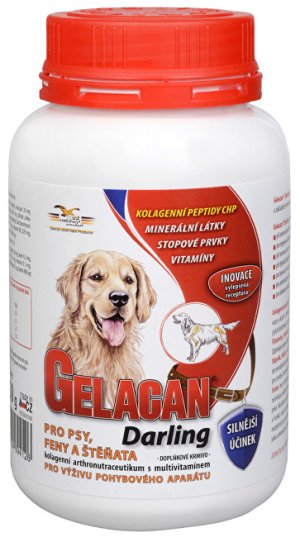 Kolagenní výživa kloubů s vitamíny. Doplňkové krmivo s vysokým obsahem kolagenních peptidů CHP, vitamínu E, selenu a základních minerálních látek potřebných pro správnou výživu a vývoj kostí a kloubů. Nově játrové aroma. Gelacan® Darling obsahuje kolagenní peptidy CHP, které vyživují a regenerují kloubní chrupavky, šlachy, vazy a kosti a zmírňují až odstraňují tak následky předchozí nedostatečné výživy nebo poškození kloubů, jejich deformaci, zabraňují dalšímu úbytku chrupavek, zlepšují hybnost a zmírňují bolestivost. Dále obsažené vitamíny, minerální látky a stopové prvky ve vyváženém poměru vhodně obohacují krmnou dávku. Optimální poměr účinných látek zvyšuje vitalitu psa, zlepšuje tělesnou kondici a urychluje regeneraci organismu. Vhodné podávat: