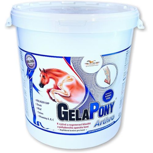 Gelapony Arthro je koncentrované doplňkové krmivo s vysokým obsahem kolagenu CHP a vitamínů. Gelapony Arthro regeneruje tkáně kloubního systému, posiluje kosti, vazy a šlachy. Díky vysokému obsahu kolagenu CHP (98,7 %) je vhodné pro intenzivně zatěžované koně a při chronických pohybových potížích.