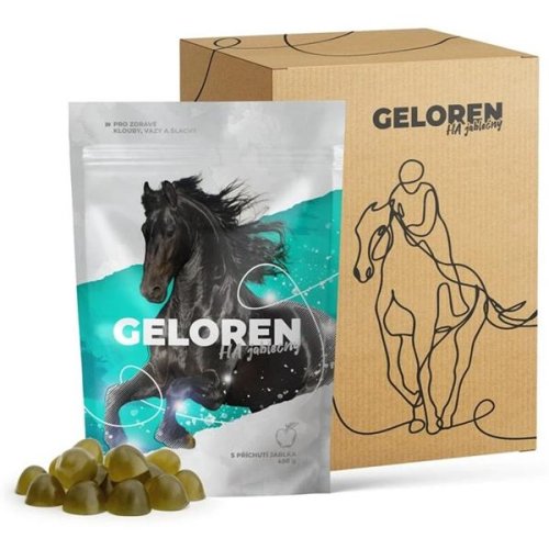 Aktivní látky (obsah v 7,5 g*): 933 mg želatiny, 143 mg chondroitin sulfátu, 30 mg kyseliny hyaluronové. *7,5 g = průměrná hmotnost 1 želé. Želé v balení: 3 × 60 ks = 180 ± 2 ks Kyselina hyaluronová: nejdůležitější složka kloubní tekutiny; promazává klouby, tlumí nárazy a pomáhá zlepšovat stav při bolestech a zánětech kloubů. Chondroitin sulfát: důležitá součást kloubní chrupavky a synoviální tekutiny; zaručuje pružnost, pevnost a odolnost chrupavky. Želatina: látka bílkovinné povahy v dobře stravitelné formě poskytující základní stavební součásti pro tvorbu kolagenu; kolagen je důležitý pro pevnost šlach a celkové zpevnění pohybového aparátu. Složení: voda, cukr, glukózový sirup, želatina vepřová (12,5 %), chondroitin sulfát (1,9 %), sorban draselný, glycerin, kyselina hyaluronová (0,4 %), zchutňující látka (jablečné aroma), řasa chlorella, kyselina citronová, povrchová úprava želé proti slepování (kokosový olej, řepkový olej a karnaubský vosk). Návod k použití: Geloren HA můžete nabídnout zvířeti přímo z ruky nebo želé nakrájet na menší části a zamíchat do krmiva. Přípravek koně většinou ochotně přijímají díky sladké chuti a višňovému aroma. Vhodné pro všechny typy koní. Dávkování: