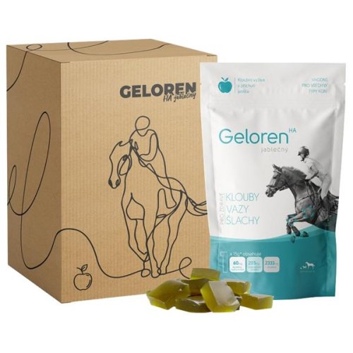 Dietetický veterinární přípravek pro koně Geloren v podobě žvýkacích želé kostiček s jablečnou příchutí, vyrobený v České republice. Vylepšená receptura obohacená o mořskou řasu chlorellu, bez škodlivých éček a barviv. Tato kloubní výživa je díky vysokému obsahu účinných látek široce doporučována chovateli koní pro péči o klouby a k prodloužení aktivního života nejen sportovních koní. Vhodné pro: