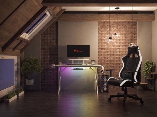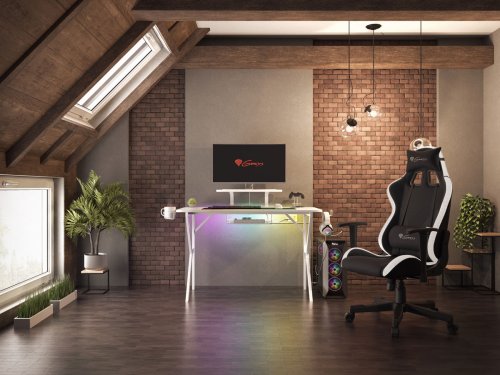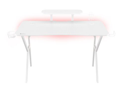 Každý prvek stolu je vyroben v bílé barvě. Karbonová povrchová úprava desky stolu v kombinaci s fenomenálním RGB podsvícením vám umožní vytvořit jedinečnou herní stanici. Přiložený dálkový ovladač vám umožní ovládat četné režimy a efekty podle vašich preferencí.