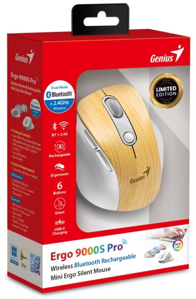 Všechno to klikání a scrollování je tak ve výsledku příjemnější a bez bolesti i při dlouhotrvající činnosti. Myš Genius Ergo 9000S Pro je vybavena optickým senzorem s nastavitelným rozlišením až 2400 DPI, díky čemuž se přizpůsobí vašim požadavkům na rychlost a přesnost pohybu. Bezdrátové připojení zajišťuje technologie Bluetooth a miniaturní USB přijímač s rozhraním 2,4 GHz.