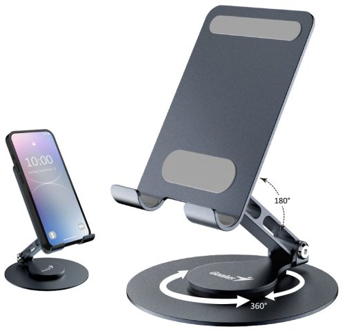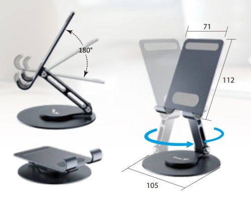 Přenosný stojan na telefon či tablet o velikosti 4" až 10", který umožňuje naklápění o 180° a otáčení o 360°. Je ideální pro čtení, videohovory nebo procházení webu. Díky skládací konstrukci a nízké hmotnosti je vhodný pro cestování.