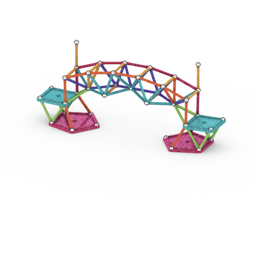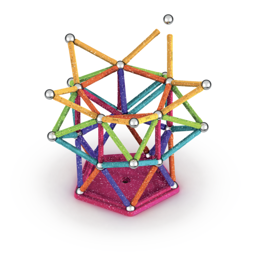 Geomag Glitter 142 dílků představuje největší stavebnici z řady Glitter, která kombinuje klasické magnetické tyčky s efektem třpytek a kovové kuličky. Tato stavebnice obsahuje 68 magnetických tyček v šesti zářivých barvách, které jsou pokryté třpytivým povrchem, což zvyšuje vizuální atraktivitu vznikajících konstrukcí. Dále balení obsahuje 68 ocelových kuliček, které fungují jako spojovací prvky, a k tomu tři čtvercové a tři pětiúhelníkové podstavce, rovněž s třpytivým efektem. Celkový počet dílků je 142, což umožňuje stavbu rozmanitých a stabilních prostorových struktur.