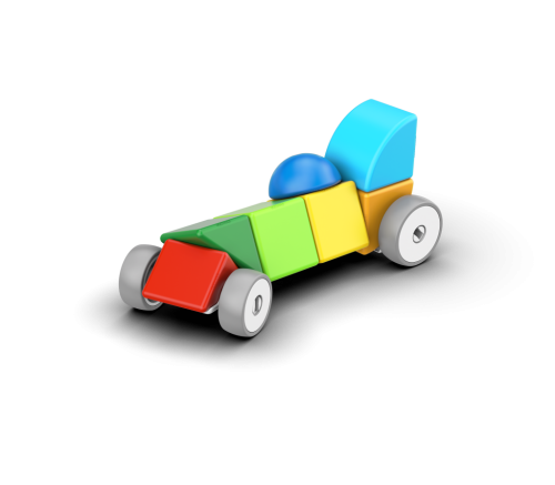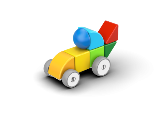 Magnetická stavebnice Obsahuje 7 magnetických prvků různých tvarů a barev a 4 kolečka se dvěma podvozky Vyrobeno ve Švýcarsku, z recyklovaného plastu