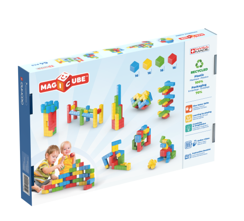 Díky speciální vnitřní konstrukci se magnetické kostičky přitahují ze všech šesti stran a drží i volně v prostoru - stavění ve 3D. Obsahuje 64 kostek ve čtyřech barvách. Vyrobeno ve Švýcarsku ze 100% recyklovaného plastu. Vhodné od 1 roku.