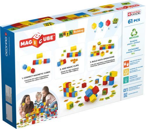 Vyzkoušejte domácí školu hrou s kostkami Geomag a pozorujte jak se Vaše ratolest učí, začíná rozlišovat číslice, tvoří první výpočty a skládá je pomocí magnetických klipů. Děti mají možnost vytvářet různé tvary, barevné kombinace a 3D struktury díky Geomag Magicubes, které jsou jedinečné v tom, že se přitahují a spojují ze všech stran. Sada obsahuje 16 magnetických kostiček ze 100% recyklovaného plastu a 45 oboustranných klipů. Barevně jsou rozlišena sudá a lichá čísla, klipy jsou oboustranné. Stavebnice pomáhá při rozvoji kreativity, jemné motoriky a pomocí hry stimuluje zvědavost, hledání řešení a zkoumání systému magnetismu.Vhodné pro děti od 3 let.