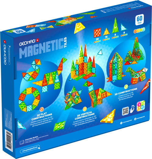 Geomag Magnetic Tiles 60 dílků představují stavebnici složenou z průhledných, strukturovaných magnetických dílků, které umožňují dětem snadno vytvářet jak 2D obrazce, tak i prostorové 3D konstrukce. Sada obsahuje přesně 60 dílků v jasných, atraktivních barvách – červené, zelené, žluté a modré – což dětem pomáhá nejen rozvíjet kreativitu, ale také učí rozpoznávat barvy a geometrické tvary. Díky magnetům umístěným po celém obvodu každého dílku lze jednotlivé kousky pevně a bezpečně spojovat, což podporuje manuální zručnost a prostorové vnímání.