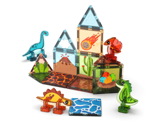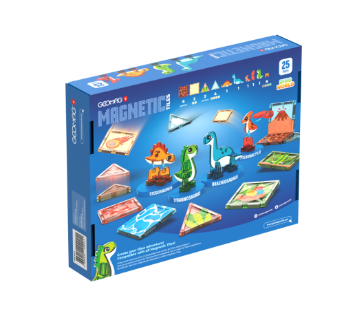Geomag Magnetic Tiles Dino obsahuje magnety na všech stranách jednotlivých geometrických tvarů. Lze tak snadno vytvářet jakékoliv 2D obrazce nebo 3D struktury. Kromě toho jsou součástí i 4 figurky dinosaurů. Stavebnice rozvíjí manuální zručnost, kreativitu a fantazii, učí barvy, geometrické tvary, ale hlavně si s ní děti užijí spoustu zábavy. Obsahuje celkem 25 dílků. Vhodné od 3 let.