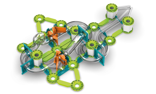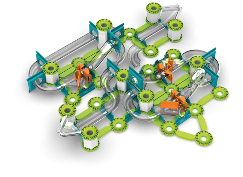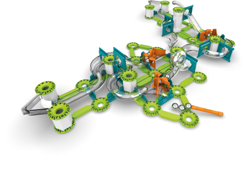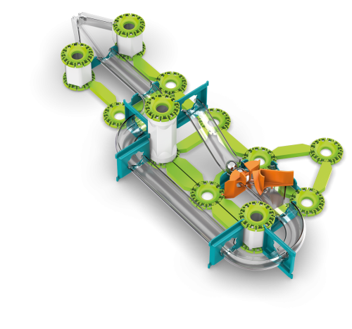Geomag Mechanics Starter Set s 153 dílky je stavebnice určená pro děti od 8 let a dospělé, která umožňuje sestavit jedenáct různých okruhů a tratí pro ocelové kuličky. Díky propracovanému systému spojování dílků lze vytvářet různé modely, které demonstrují fyzikální zákony v praxi. Hlavními prvky jsou průhledné dráhy a oblouky, zelené spojovací části a bílé válcové podpěry, které společně tvoří stabilní a variabilní konstrukce. Oranžové mechanické části jako magnetické dělo nebo pohyblivé prvky přidávají stavebnici dynamiku a zábavu při sledování pohybu kuliček.