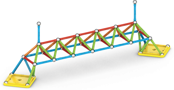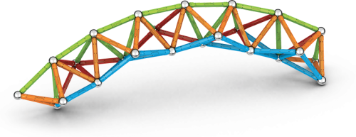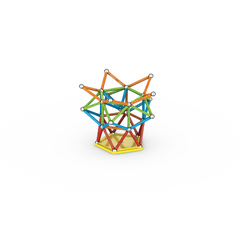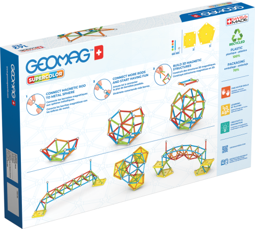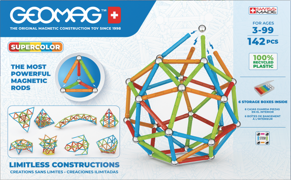 Geomag Supercolor je stavebnice, která nabízí 142 dílků pro kreativní a zábavné stavění magnetických konstrukcí. Sada obsahuje 68 magnetických tyček v zářivých barvách, které jsou potažené plastem vyrobeným ze 100% recyklovaného materiálu, díky čemuž je produkt šetrný k životnímu prostředí. K magnetickým tyčkám je přidáno 68 ocelových kuliček a 6 plastových podstavců – tři čtvercové a tři pětiúhelníkové – které umožňují stabilní a pevné spojení jednotlivých dílů. Díky barevnému provedení a kvalitnímu zpracování jsou výsledné stavby vizuálně atraktivní a zároveň odolné.