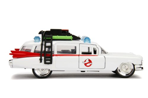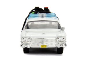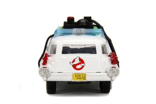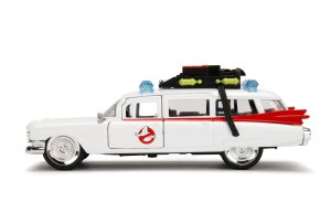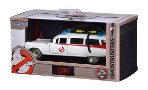 Kovový model auta Gostbusters ECTO-1 v měřítku 1:32 na volnoběh. Otevírací dveře. Velikost 14 cm. Displej obsahuje 6 ks.