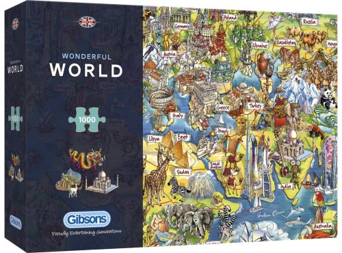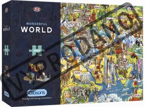 Puzzle s motivem kreslených světadílů a států Marie Rabinky od anglického výrobce GIBSONS. Rozměr složeného puzzle cca 68 x 49 cm