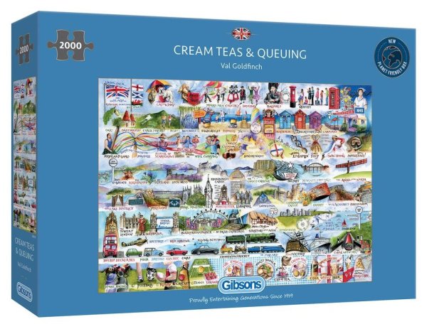 Krémový nebo-li smetanový čaj je forma odpoledního čaje, který se skládá z čaje podávaného s kombinací koláčků, krémové smetany, džemu a někdy i másla. Přesto že je to zvláštní specialita Devonu a Cornwallu, krémové čaje se prodávají v čajovnách po celé Anglii a také v některých dalších částech společenství. Puzzle od anglického výrobce GIBSONS. Rozměr složeného puzzle cca 98 x 68 cm