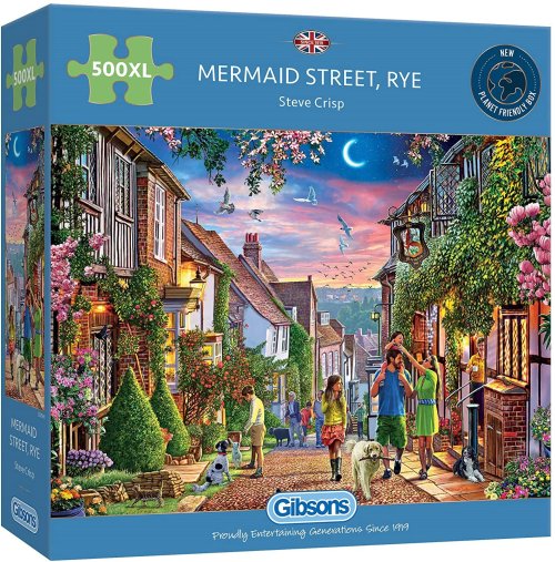 Toto puzzle o 500XL dílcích zobrazuje poklidnou letní noční scénu na Mermaid Street v Rye, jedné z nejhezčích ulic v Británii. Uvolněné rodiny venčící své domácí mazlíčky, útulná světla zářící z oken a hejno ptáků vznášející se na měsíční obloze. Neváhejte a zajděte si na skleničku na dobrou noc do proslulého hostince Mermaid Inn. Součástí balení je předloha skládaného motivu. Rozměr složeného puzzle cca 68 x 49 cm