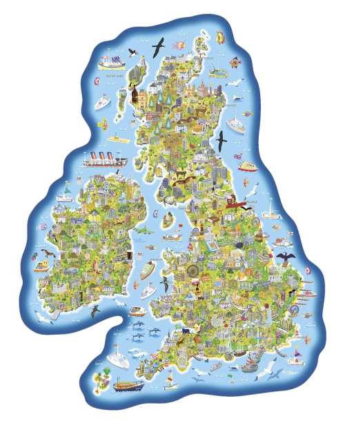 Bohatě ilustrované obrysové puzzle Velké Británie a Irska s obrázky zvířat, pamětihodností a zajímavostí, které jsou typické pro jednotlivé oblasti Britských ostrovů. Kromě spousty detailů obsahuje puzzle navíc speciální stejně tvarované dílky s názvy hrabství , které lze umístit přímo do puzzle obrázku. Puzzle tak zároveň slouží jako vynikající pomůcka pro vzdělávání a zlepšování zeměpisných znalostí. Rozměr složeného puzzle cca 48 x 62 cm