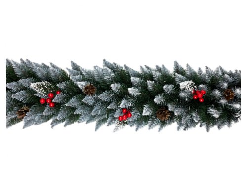 Girlanda z umělého jehličí. Konce větviček jsou bíle obarveny, pro získání efektu zasněžení Je dozdobena šiškami v přírodní barvě a červenými bobulkami. Vhodné pro vánoční sezónu. Rozměry: délka 200 cm. Barva: zelená, bílá.
