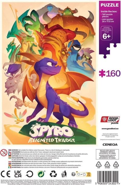 Good Loot Kids Puzzle: Spyro Reignited Trilogy: Heroes (160 dílků) Spyro je nadčasový společník na cestách, jehož dobrodružství baví už léta. Tímto vzorem jsme chtěli zachytit jeho sebevědomou a okázalou povahu. Díky postavičkám viditelným v pozadí můžeme při rozvržení oživit touhu dozvědět se o hře více nebo zavzpomínat na bláznivé výpravy.