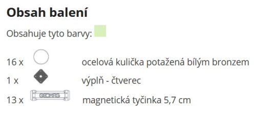 Stavebnice GEOMAG - Panels Glow 30 dílků obsahuje 13 fluorescenčních tyčinek, 16 poniklovaných kuliček a 1 výplň ve tvaru čtverce. Tyčinky i výplně ve tmě svítí. Stavebnice je ideální na stavbu vesmírných modulů a lodí. Stavebnice je vhodná pro děti od 3 let. Počet tyčinek: 13 (6cm) Počet kuliček: 16 Počet výplní: 1 GEOMAG je švýcarská konstrukční stavebnice, která umožňuje stavbu nejrozmanitějších tvarů, objektů a obrazců. Základním stavebním prvkem jsou magnetické tyčinky s plastovým nebo fosforovým potahem a poniklované kuličky o průměru 12,7 mm. Další prvky stavebnice jsou základové desky a dělící plastové panely (výplně). Stavebnice GEOMAG lze využít nejenom na hraní, ale i jako atraktivní učební pomůcku ve školách. GEOMAG podporuje tvořivost, představivost, jemnou motoriku a kombinační schopnosti. Stavebnice GEOMAG je vyrobena s švýcarskou přesností, v souladu s nejpřísnějšími mezinárodními kritérii kvality a bezpečnosti , je zdravotně nezávadná a má vynikající odolnost proti opotřebení. ilustrační video magnetické stavebnice Geomag Kids ilustrační video magnetické stavebnice Geomag Kids
