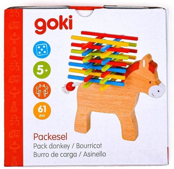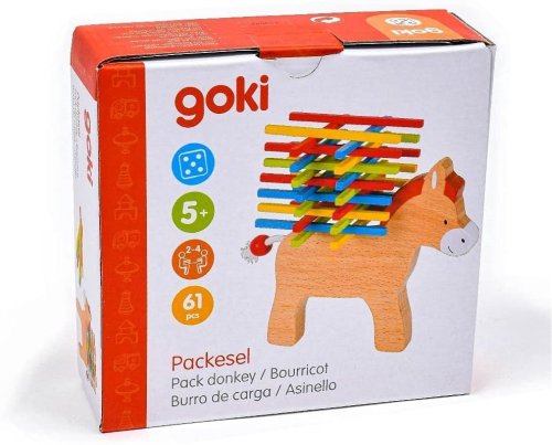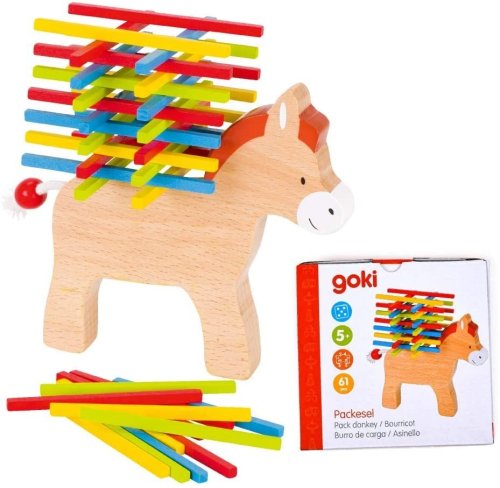 Balanční hra Oslík vyrobená ze dřeva rozvíjí jemnou motoriku, šikovnost a trénuje trpělivost. Hraj sám nebo s dalšími hráči. Dřevěné tyčky je třeba pokládat tak, aby se náklad nepřevrhl. Chce to pevnou ruku a skvělou taktiku. Heslo hry: ROVNOVÁHA. Balení obsahuje: oslíka, 61 barevných tyček, návod. Rozměry: 10,5 x 12 cm. GOKI patří mezi nejvýznamnější evropské výrobce hraček s vysokou pedagogickou a didaktickou kvalitou. Firma klade důraz na bezpečnost hraček, jejich zdravotní nezávadnost a dbá na obnovitelné zdroje. Dřevo je bráno tam, kde může dorůstat. Používané dřeviny jsou javor, buk, ořech, lípa, jasan, borovice, bříza a gumovník. Barvy a laky pocházejí od menších výrobců.